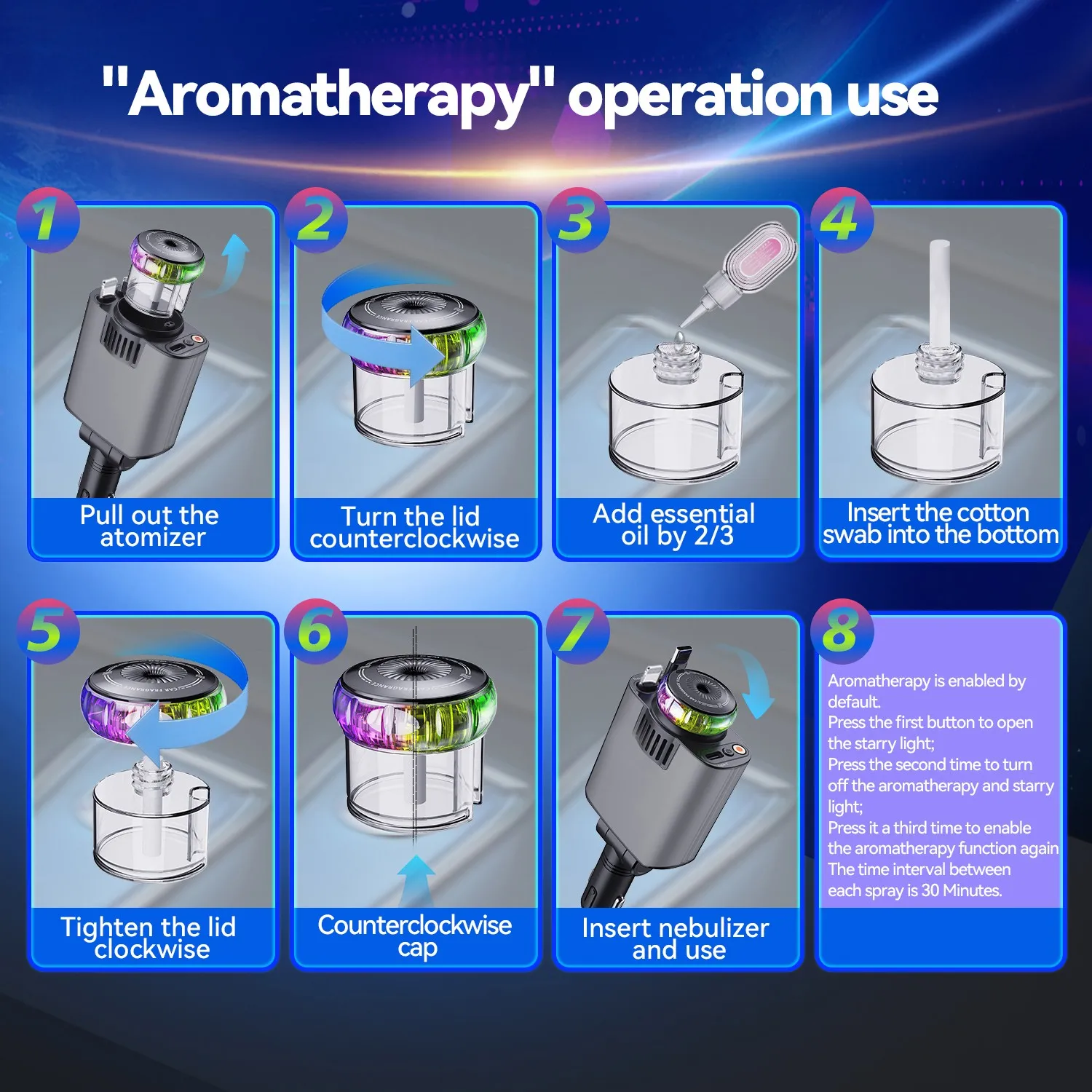 Description:-Multifunctional design: This car mobile phone charger not only has a charging function, but also comes with an aromatherapy design and starry sky lights. It integrates a variety of practical functions, one thing for multiple uses, convenient and practical.-Fast charging: Supports three-in-one super fast charging, which can provide fast charging for mobile phones, tablets and other devices at the same time, saving charging time and ensuring that the device always keeps sufficient power during driving.-Starry sky light effect: With a purple starry sky light design, it illuminates the interior space of the car, creates a romantic and dreamy atmosphere, brings a comfortable and peaceful feeling to the driver and passengers, and increases driving pleasure.-Aromatherapy design: Built-in aromatherapy function, aromatherapy tablets or aromatherapy oil can be added to release a light fragrance, purify the air in the car, remove odors, improve the air quality in the car, and make driving more comfortable.-Odor removal: The cigarette lighte r deodorization function can quickly and effectively remove bad odors such as smoke and odor in the car, keep the air in the car fresh, improve driving comfort, and create a pleasant driving environment for you.
