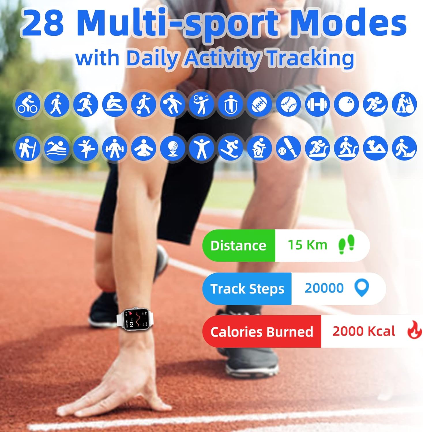- 【28 SPORTS MODES AND IP68 WATERPROOF】 Smart watch Records daily data such as steps, distance and calories burned. With 28 built-in sports modes and IP68 water resistance, which coverd most sports enthusiasts. The GPS Sport activity tracker can also control the music on your phone, provide notifications about workout stages, conditions and heart rate zones, and create a sports data report in the app after your workout is complete.