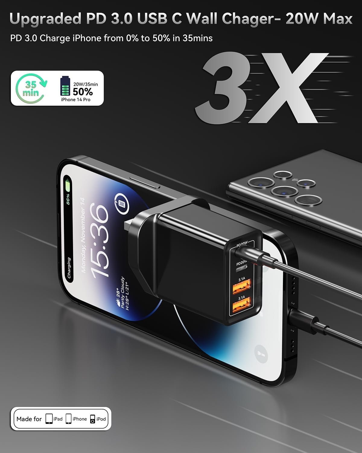 • ⚡【Universal Compatibility】⚡40W USB C Fast Charger compatible with All smartphones and tablets,such as iPhone 14/14 Pro/14 Pro Max/14 Plus/13/13 Pro/13 Pro Max/12/12 Pro/12 Pro Max/11/11 Pro/11 Pro Max,iPhone XS/XR/X/10/8/7/6/SE,iPad Pro/Air/Mini,Samsung Galaxy S22/S21/S20/S10/S9/S8/S7/A12/A13/A22/A32/Note 20 10,LG,Motorola,Google Pixel,Kindle,Tablets,etc.