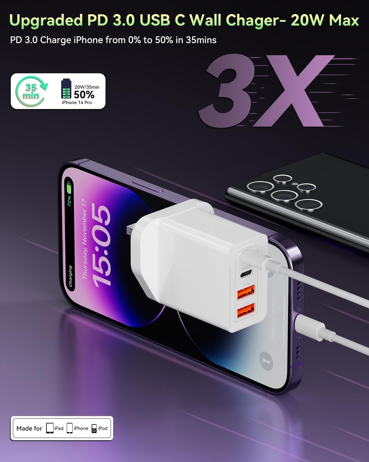 - ⚡️【High Speed Charging】 Experience 3X faster charging versus 5W adapters. This USB C Charger achieves 50% iPhone 13 charge in 30 minutes using original cables. Fast Charger technology optimizes power delivery efficiency.