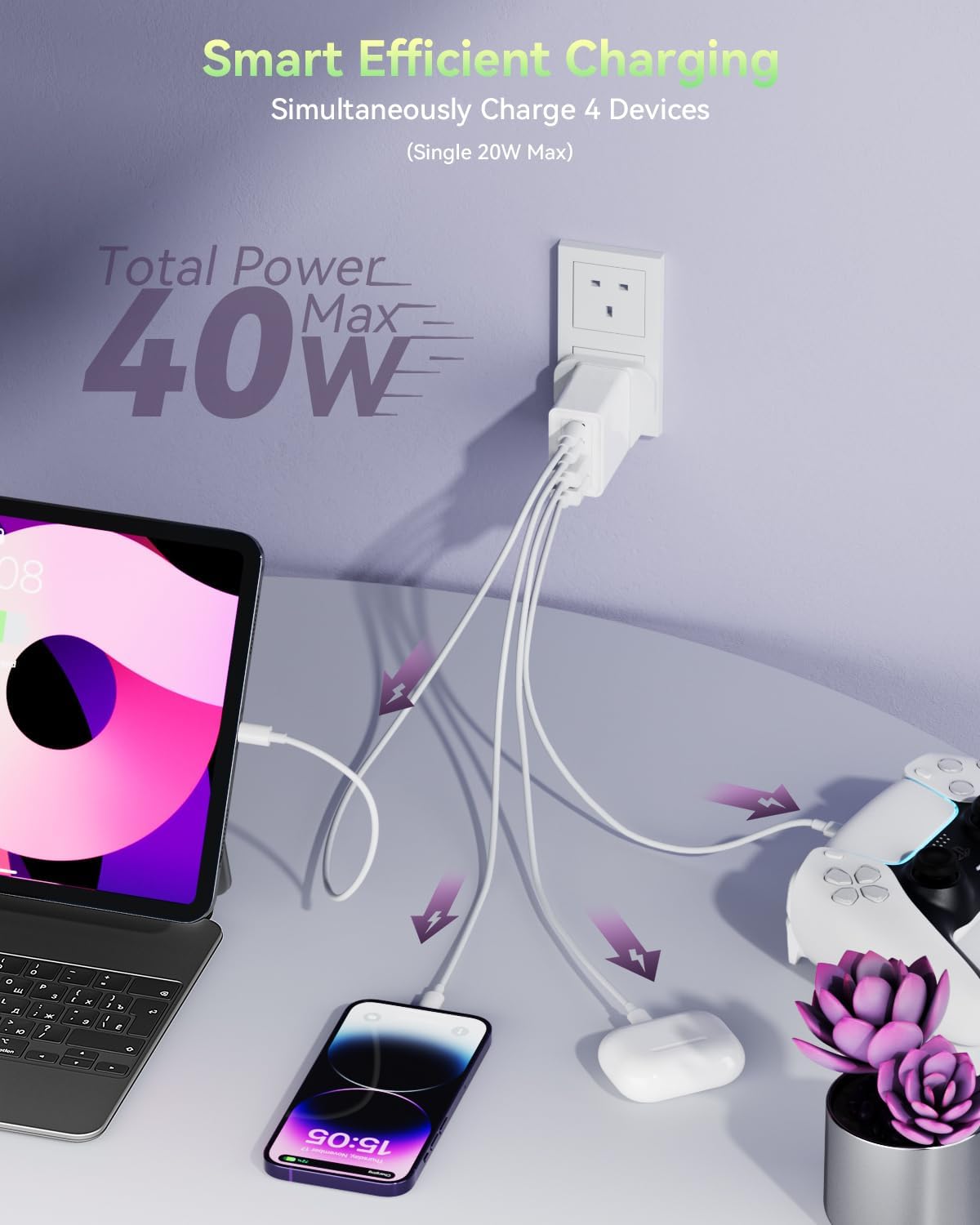 - ⚡️【Versatile Charging Options】 With 2×USB-A (15W) + 2×USB-C (20W), the 40W USB C Fast Charger enables simultaneous multi-device charging. Total 40W output ensures powerful performance for phones, tablets, and accessories.